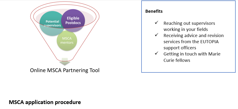 We have created a stable online platform shared by the EUTOPIA network to enable fruitful collaboration between excellent Marie Skłodowska-Curie candidates and potential supervisors willing to mentor young researchers. If you are a Postdoctoral researcher interested in a MSCA within EUTOPIA, you are invited to use the new MSCA Partnering Tool to find suitable supervisors from other EUTOPIA universities.